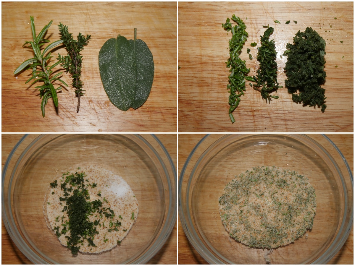 Preparate un trito di erbe aromatiche (io ho usato rosmarino, timo e salvia) e unitelo al pangrattato insieme a un po' di sale.