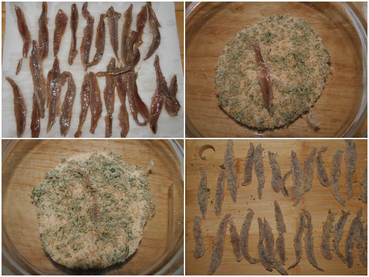 Riprendete i filetti di alici e impanateli, singolarmente, nel pangrattato aromatizzato.