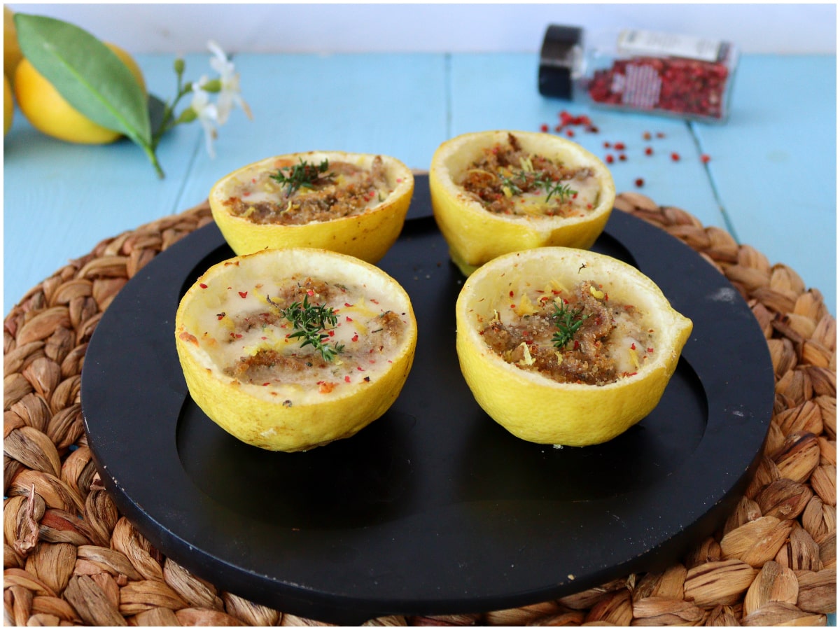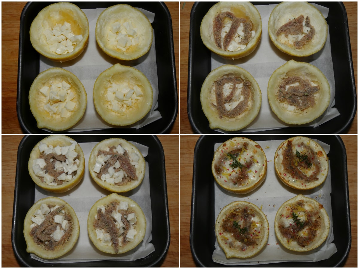 Componete i limoni: disponete i gusci di buccia sulla teglia rivestita di carta forno e riempiteli a strati con mozzarella e alici, concludendo con queste ultime e con qualche aroma (io ho usato timo, peperoncino e buccia di limone).