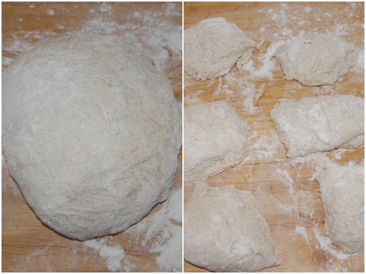 Quando l'impasto sarà almeno raddoppiato, sgonfiatelo leggermente con le mani infarinate e dividetelo in 6 pezzi più o meno uguali tra loro.