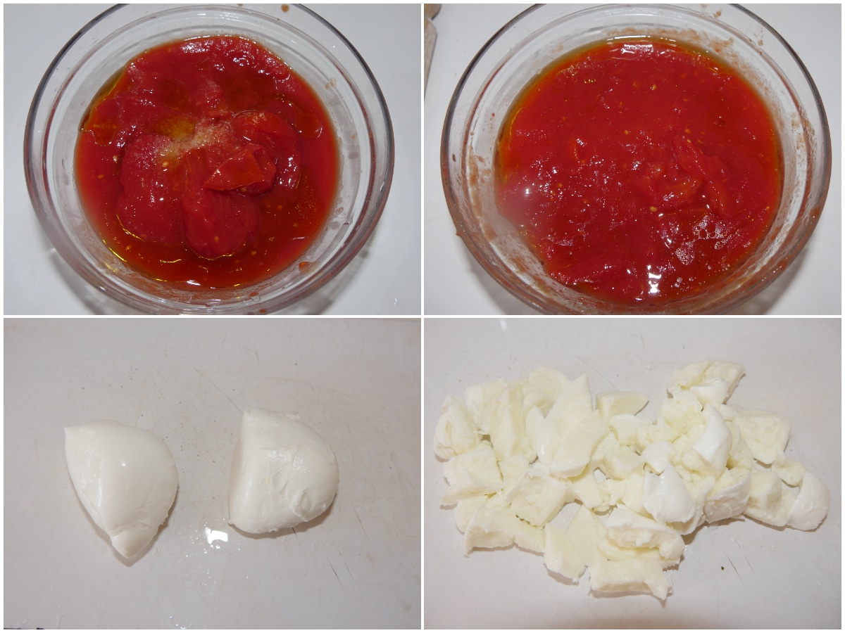 Nel frattempo, sminuzzate i pomodori e conditeli con sale e olio; a parte, tagliate la mozzarella e lasciatela asciugare un po' in frigorifero.