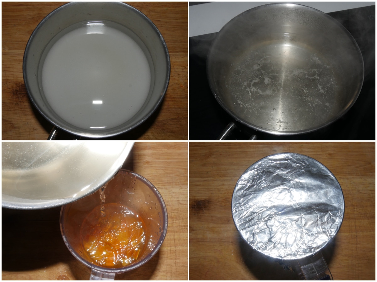Preparate uno sciroppo di acqua e zucchero portandoli insieme a ebollizione, quindi fatelo raffreddare prima di unirlo al composto di alcol.
