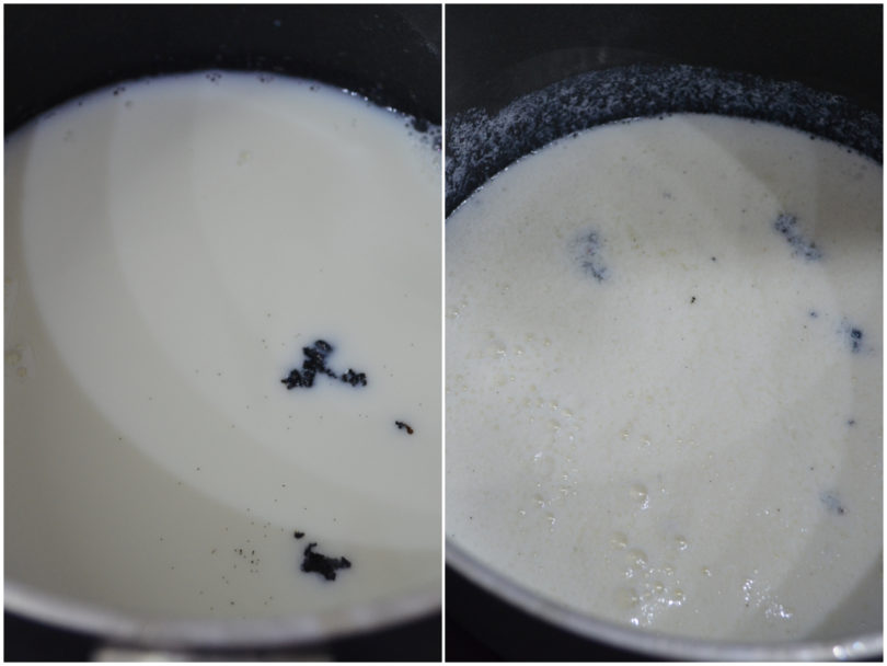 Versate panna, latte e zucchero in un pentolino, aggiungete i semi di mezza bacca di vaniglia e portate a bollore.