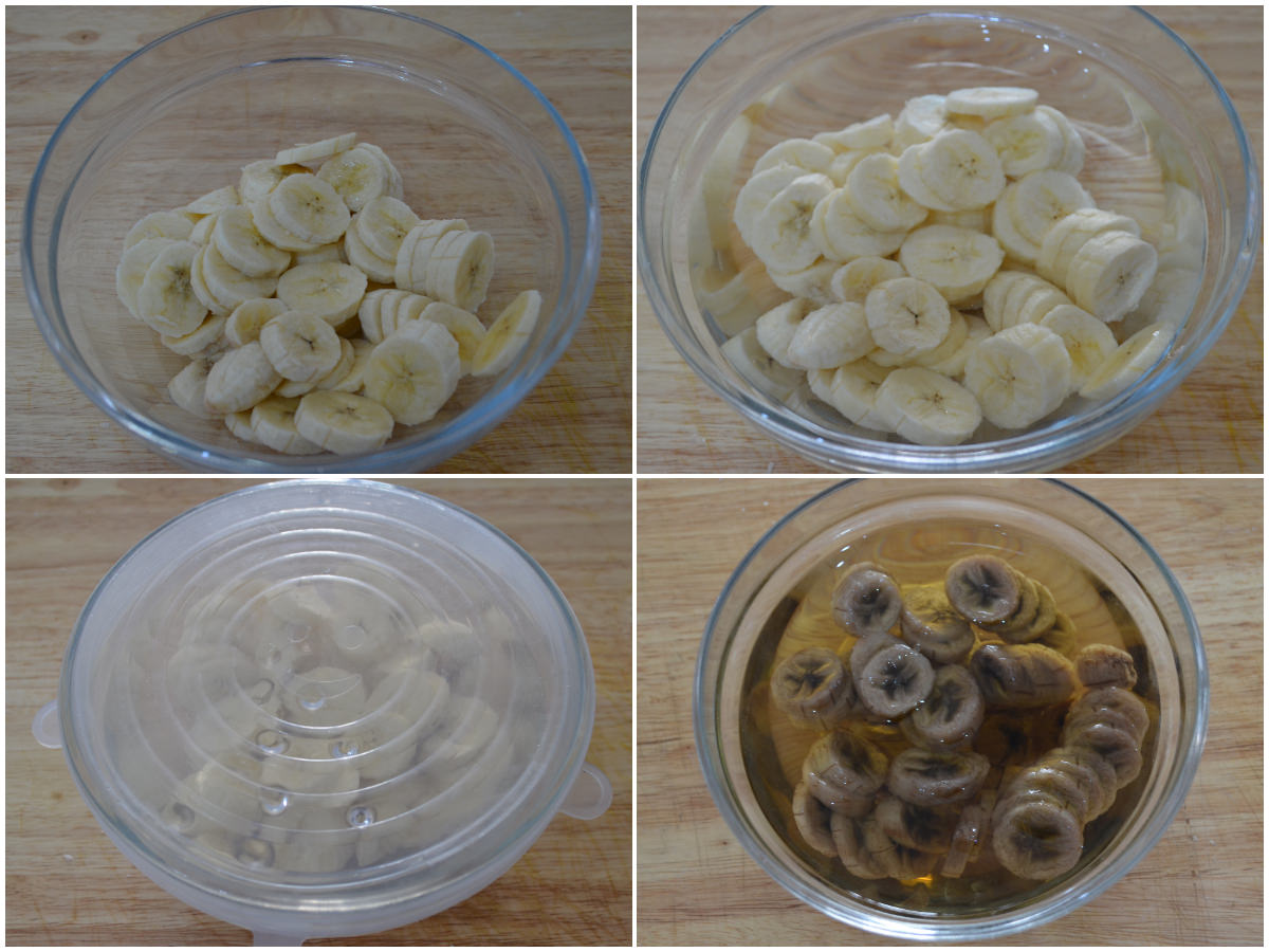 Quando riprenderete il contenitore, vedrete che l'alcol si sarà colorato leggermente e le banane si saranno annerite: è tutto normale.