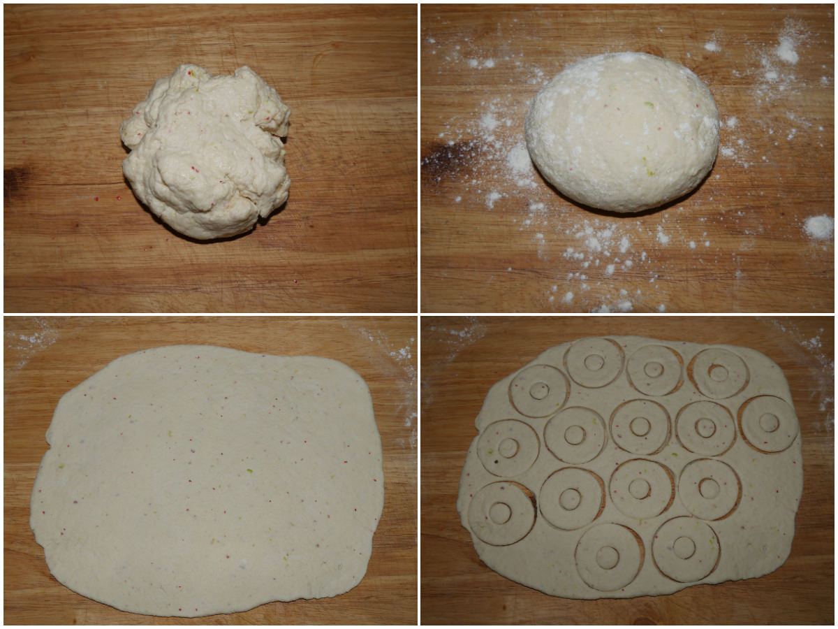 Lasciate riposare l'impasto per 10 minuti a temperatura ambiente, quindi stendetelo con un matterello e ricavate le vostre macine, usando 2 diversi coppapasta tondi, uno da circa 8 cm e l'altro, per fare il foro centrale, da circa 2 cm.