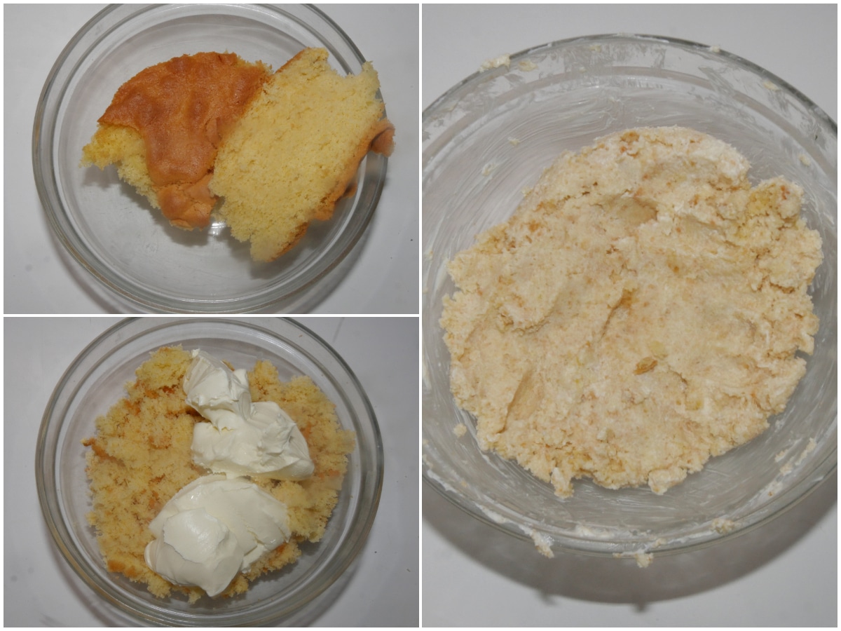 Unite in una ciotola pan di Spagna sbriciolato e Philadelphia e amalgamate fino ad ottenere un composto malleabile.