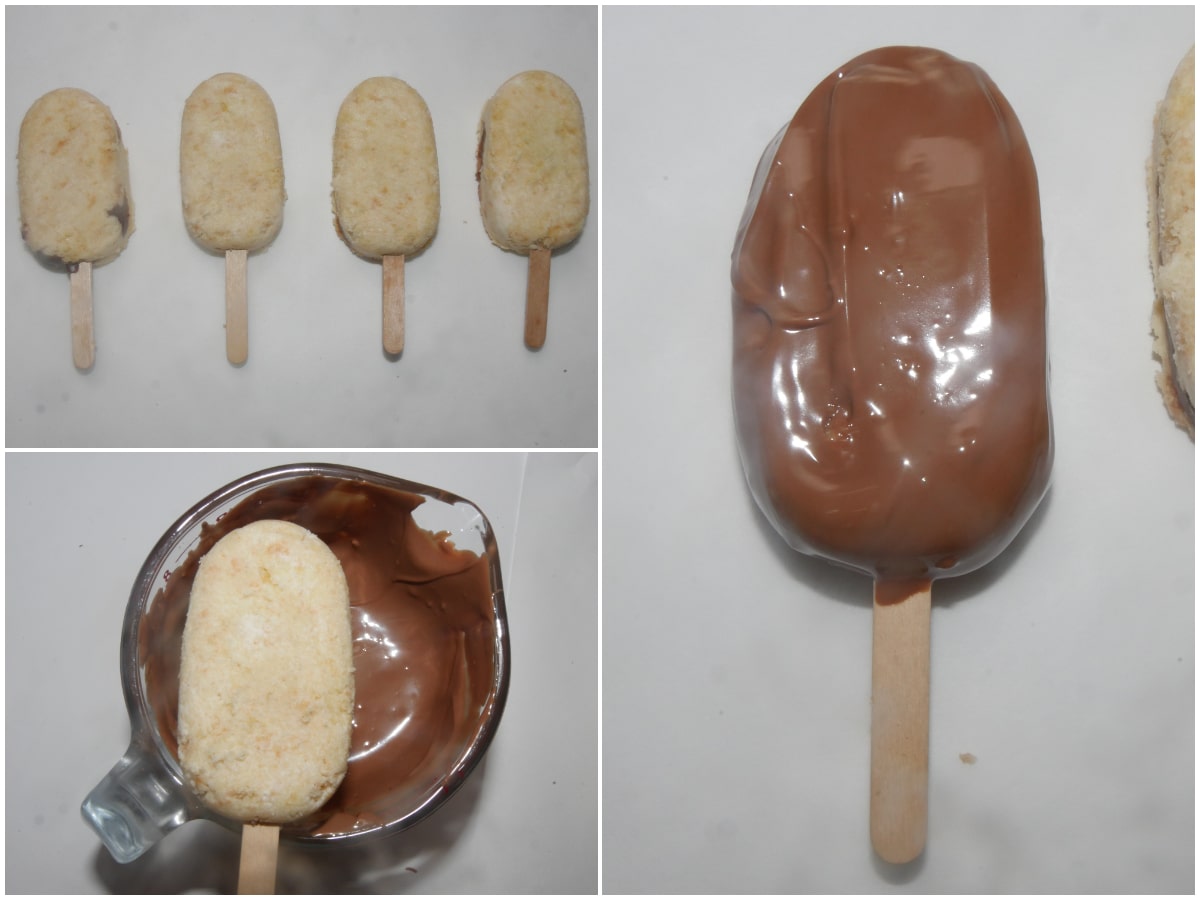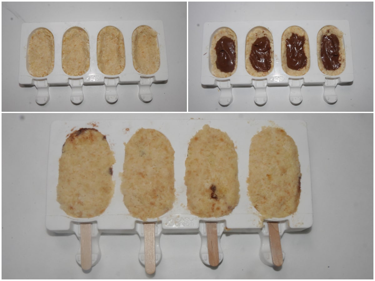 Riempite l'avvallamento con la Nutella, quindi richiudete con l'impasto restante (non vi preoccupate se si sporcano un pochino di Nutella, tanto poi andranno ricoperti di cioccolato), quindi infilate dentro gli stecchi da gelato e lasciate riposare in freezer per 15-20 minuti.