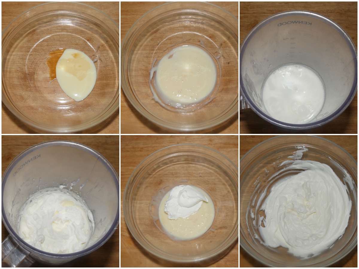 Innanzitutto preparate il gelato: unite in una ciotola latte condensato e vaniglia, poi montate a parte la panna ben fredda di frigo e aggiungetela al composto, mescolando con una spatola con un movimento dal basso verso l'alto, in modo da non farla smontare.