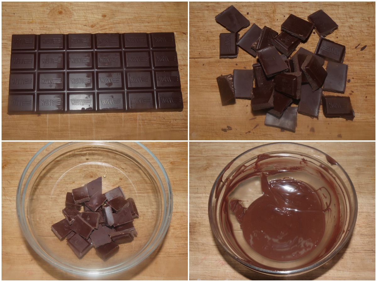 Preparate il cioccolato fondente per la glassatura: fatelo a pezzetti e scioglietelo (in microonde o a bagnomaria).