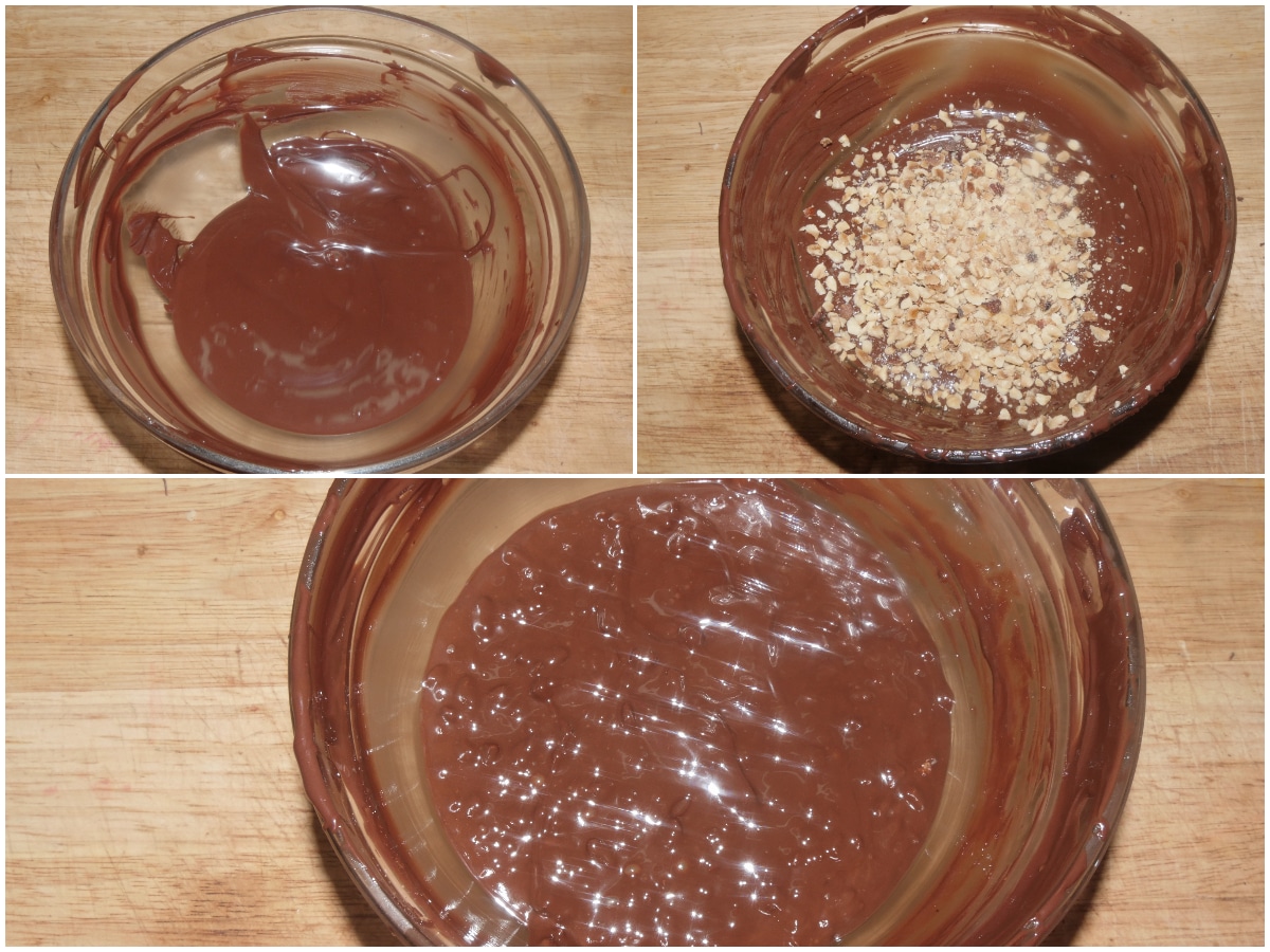 Sciogliete anche il cioccolato al latte e incorporate le mandorle tritate.