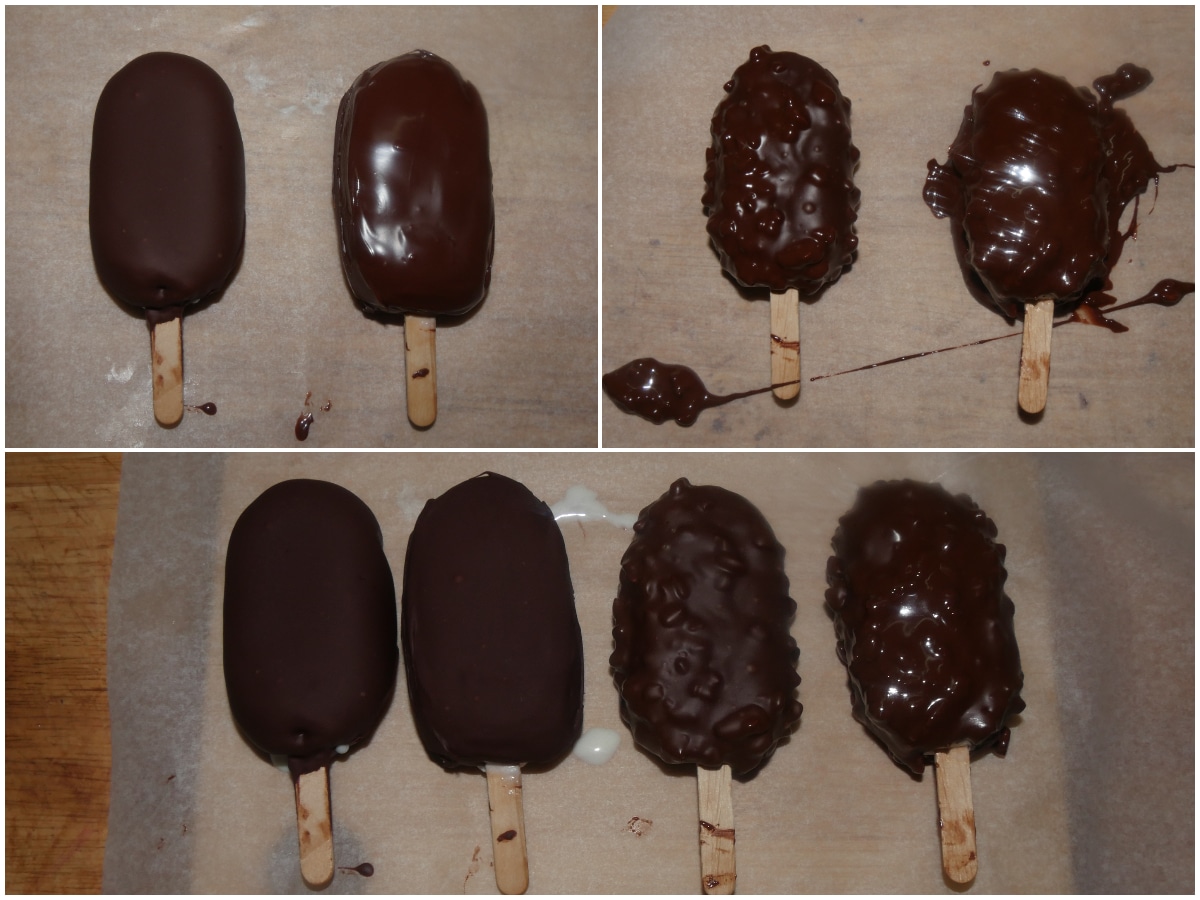 Ciao, anch’io ho avuto problemi con la glassatura, ho cambiato 3 tipi di cioccolato fondente, ma niente, si staccava via come se il gelato fosse impermeabile. Ho pensato fosse la brina intorno e li ho tamponati con uno scottex…ho anche provato a lisciarli con il palmo della mano come fanno vedere per le torte moderne prima di versarvi la glassatura… niente da fare: 16 gelati e nessuno si è glassato