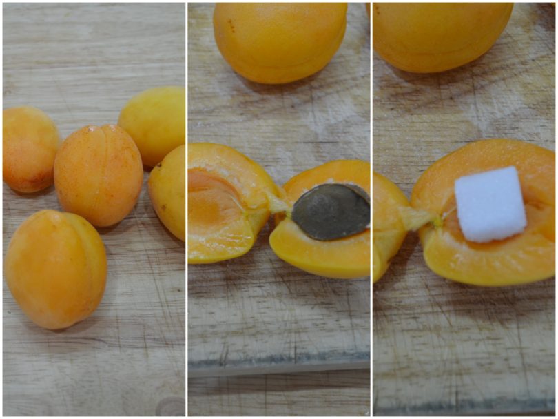 Nel frattempo, lavate e asciugate le albicocche, apritele, eliminate il nocciolo, sostituitelo con una zolletta di zucchero (o 1 cucchiaino di zucchero), richiudete con l'altra metà e fate riposare anche queste per 2 ore.
