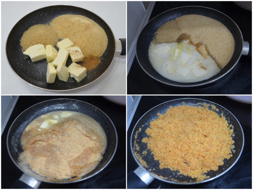 Nel frattempo fate tostare il pangrattato in una padellina antiaderente con zucchero, cannella e burro, senza farlo bruciare o caramellare troppo.