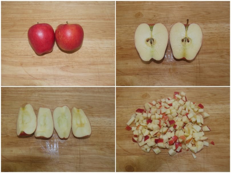 Analogamente, lavate bene la mela (NON sbucciatela, perché la buccia è ricca di pectina) e tagliatela a spicchi (per eliminare il torsolo) e poi a pezzetti.
