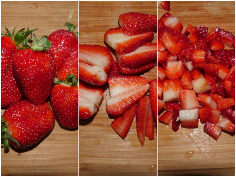 Lavate le fragole, eliminate il picciolo e tagliatele a cubetti.