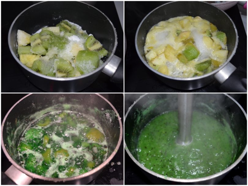 Mettete la frutta in una pentola, aggiungete zucchero e succo di limone e iniziate la cottura, mescolando spesso.