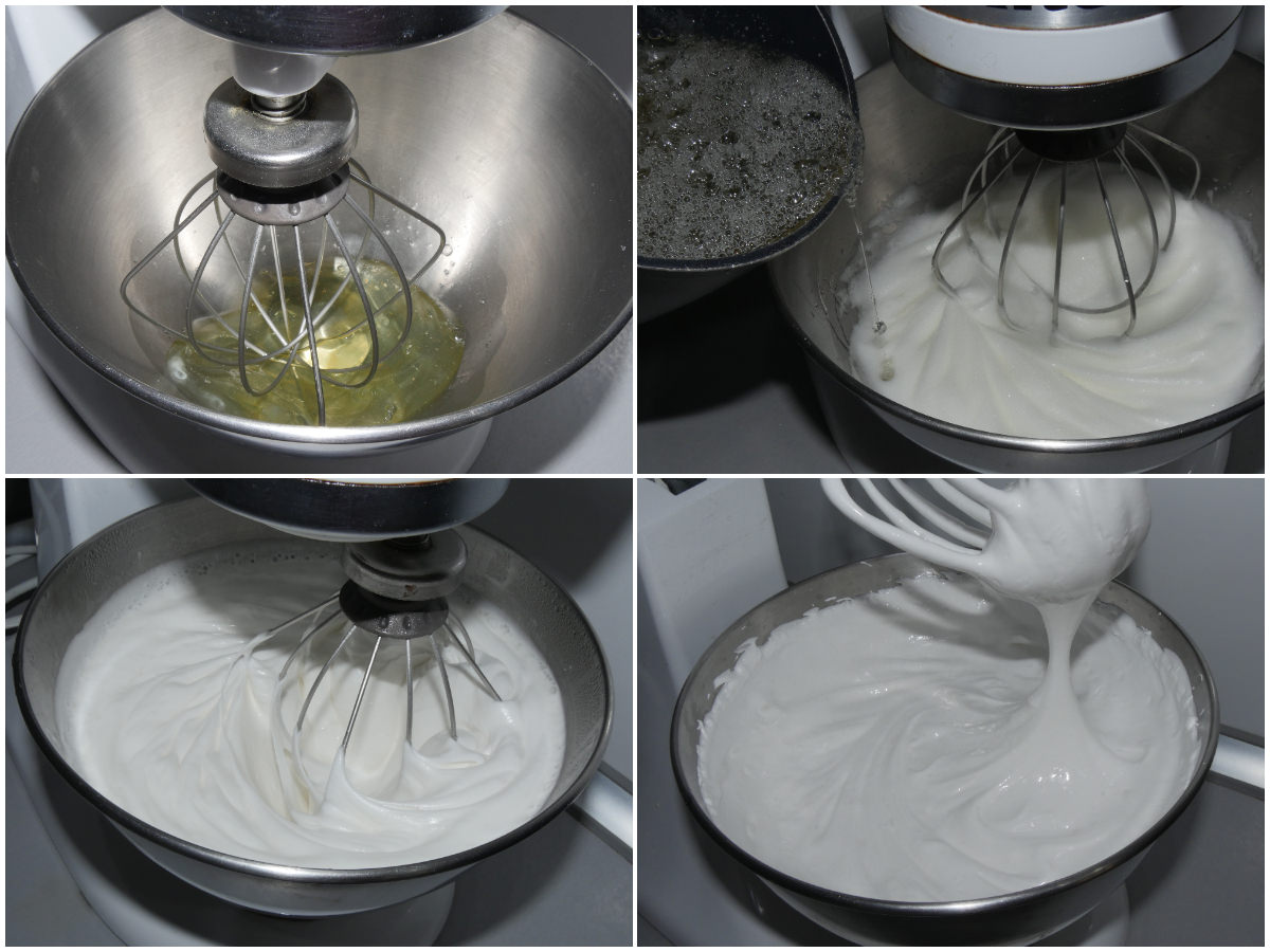 Nel frattempo che lo sciroppo arriva a temperatura potete iniziare a montare gli albumi: quando saranno montati a neve ben ferma e lo sciroppo sarà pronto, iniziate ad incorporarlo a filo negli albumi, continuando a montare con le fruste.