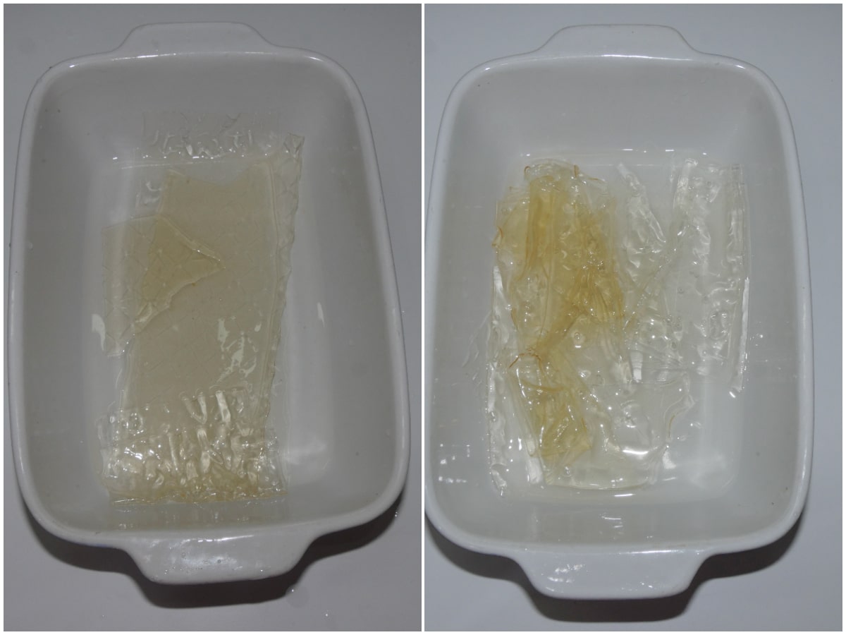 Innanzitutto mettete la colla di pesce in ammollo nell'acqua fredda (gli 85 gr) e lasciatela riposare così.