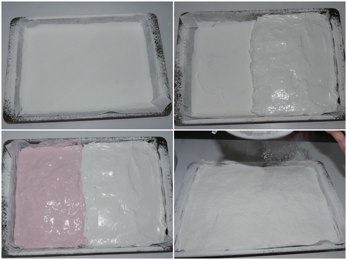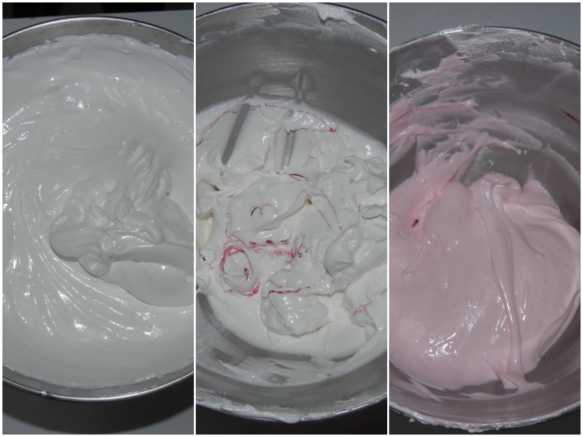 Versatene metà in una teglia rivestita di carta forno, quindi distribuiteci sopra la meringa (cercando di tenere separati i colori).
