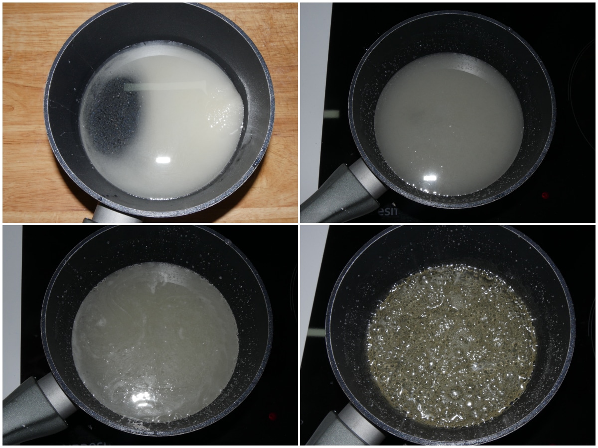 Intanto, versate acqua (gli 80 gr), zucchero e glucosio in un pentolino per preparare lo sciroppo: se avete un termometro da cucina, dovrete arrivare alla temperatura di 115-120°C; se non avete un termometro per dolci, portate a ebollizione e lasciate bollire per qualche minuto, intingete una forchetta nello sciroppo e soffiate delicatamente attraverso i rebbi: lo sciroppo sarà pronto quando si gonfierà come una bolla di sapone.