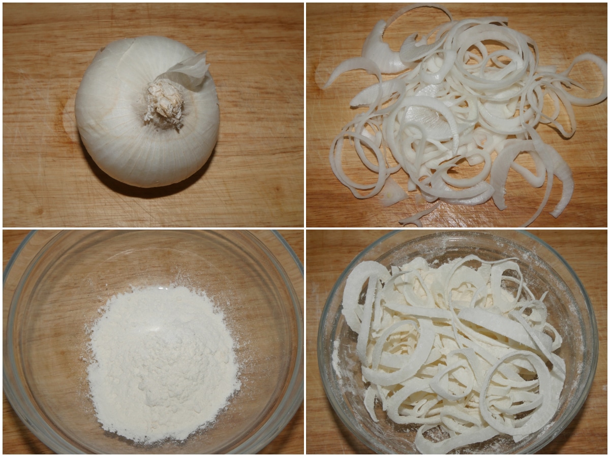 Mondate la cipolla, tagliatela a fettine e infarinatela.