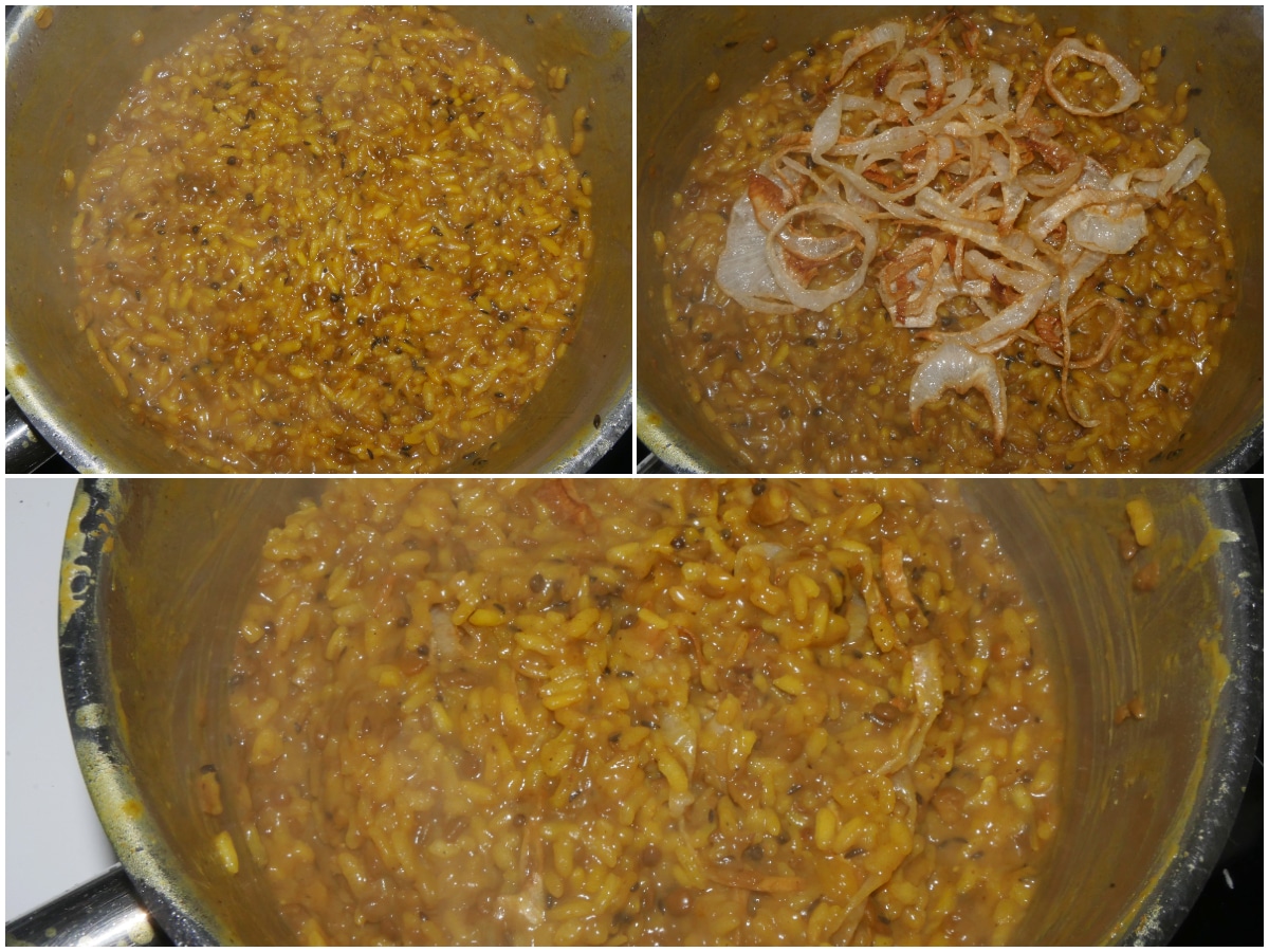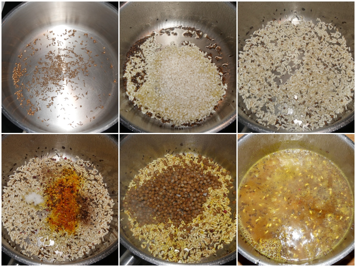 Fate tostare coriandolo e cumino in una casseruola, unite riso e olio e lasciate tostare il riso, quindi aggiungete prima le spezie (curcuma, pimento, zucchero e pepe) e mescolate, poi aggiungete le lenticchie (scolate) e l'acqua.