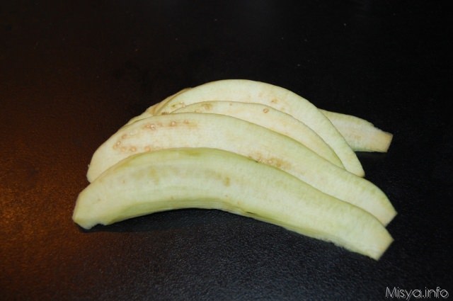 Spuntare e togliere la buccia alle melanzane. Tagliare nel senso della lunghezza delle fette dello spessore di 3 mm circa.