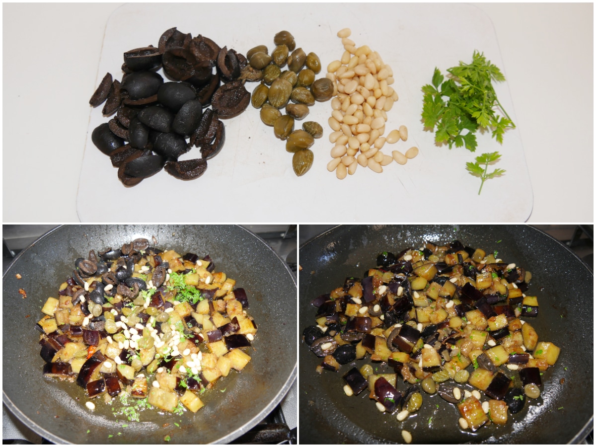 Nel frattempo denocciolate le olive e tagliatele a metà, dissalate i capperi, lavate e tritate il prezzemolo, preparate i pinoli.