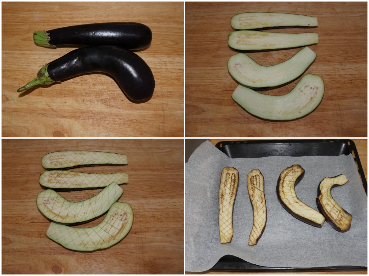 Innanzitutto lavate le melanzane, mondatele, tagliatele a metà per il lungo, incidete la polpa con la lama di un coltello creando un reticolo di tagli e cuocete per circa 20 minuti a 200°C, in forno ventilato già caldo: le melanzane dovranno risultare morbide.