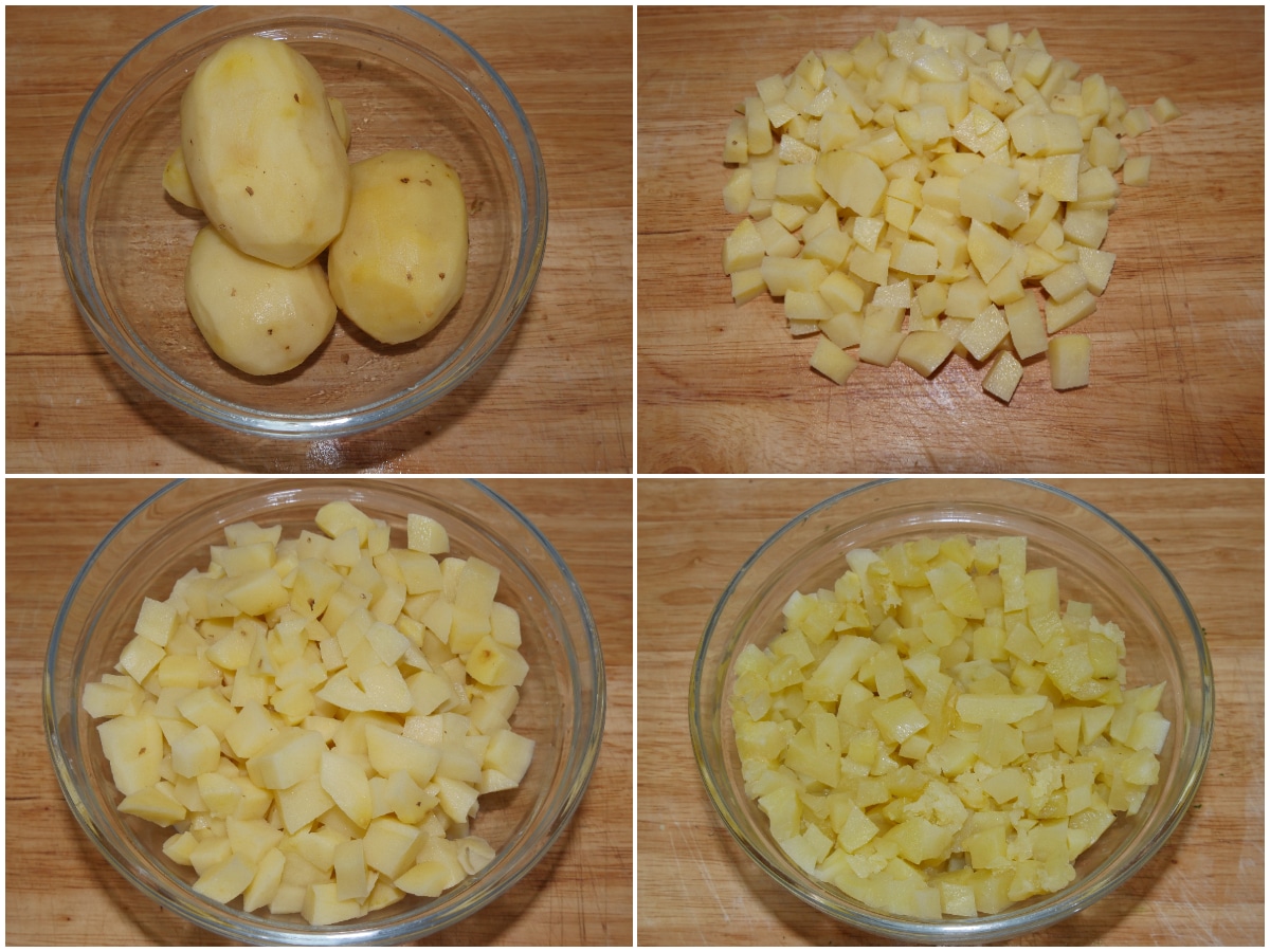 Nel frattempo pelate le patate, lavatele, tagliatele a cubetti e cuocetele per 5-7 minuti (o finché non risulteranno morbidi) in microonde, in un contenitore idoneo, alla massima potenza.
