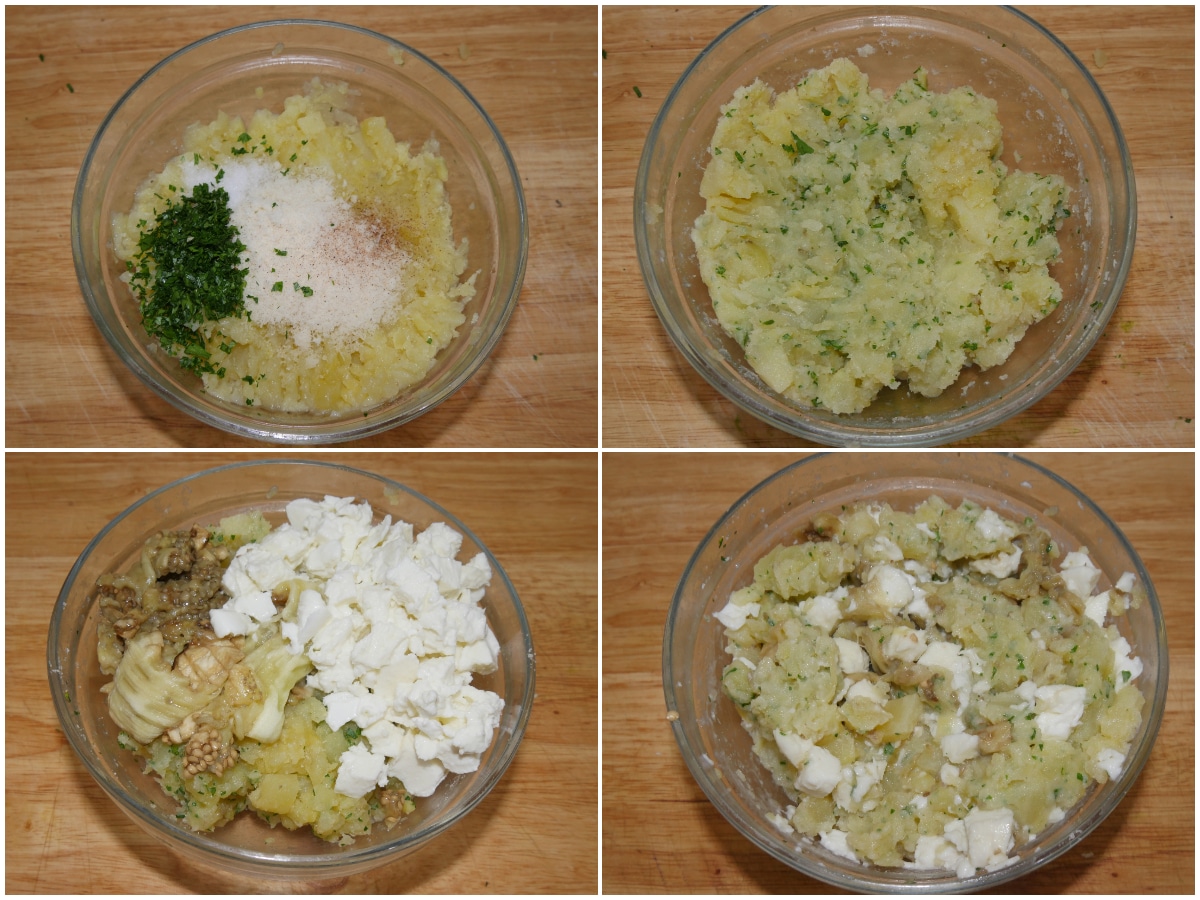 Schiacciate le patate con i rebbi di una forchetta e mischiatele con prezzemolo tritato, grana, sale e noce moscata; infine incorporate anche la polpa delle melanzane e la mozzarella a cubetti.