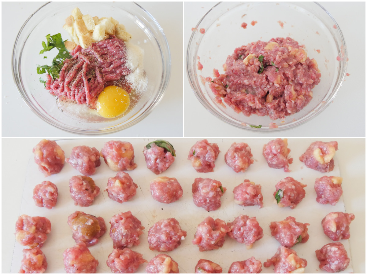 Nel frattempo preparate le polpettine: unite in una ciotola macinato, sale, pepe, prezzemolo tritato, pane leggermente spugnato e strizzato, uovo e parmigiano e mescolate, quindi create le polpettine con le mani umide, facendo delle piccole pallottoline di impasto di un paio di cm di diametro.