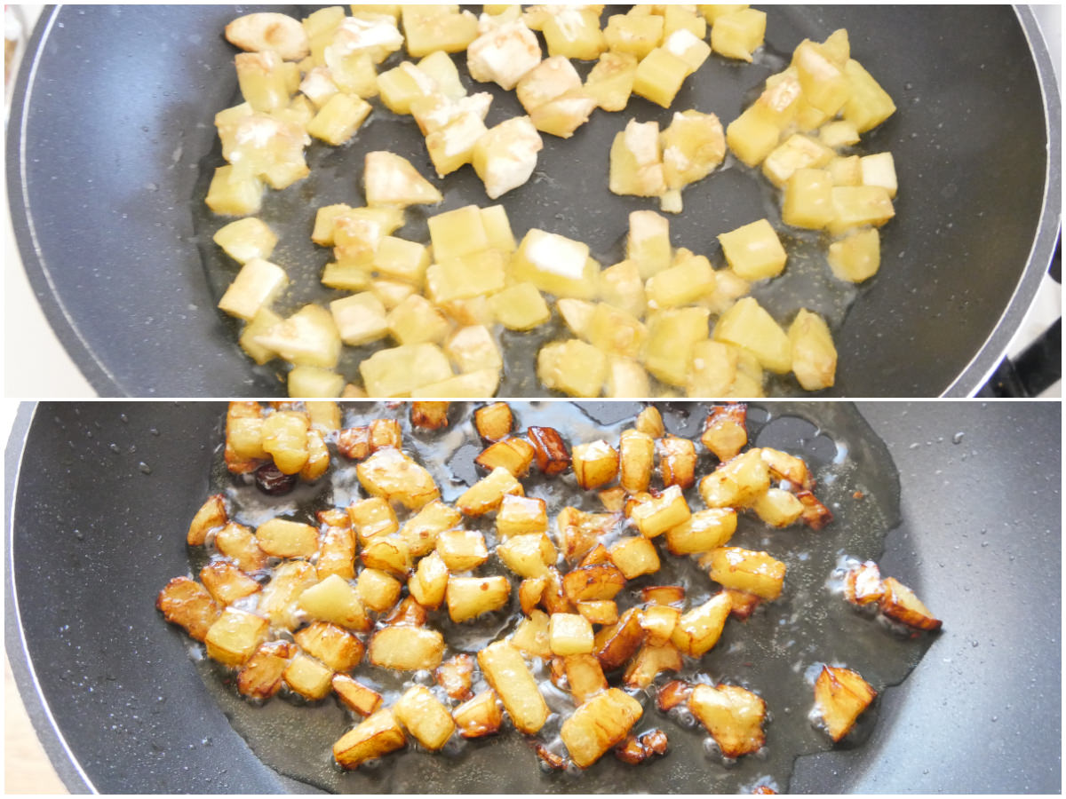 Mettete i gusci da parte e, nella stessa padella, cuocete anche la polpa, girando spesso per far cuocere e dorare uniformemente anche i dadini.
