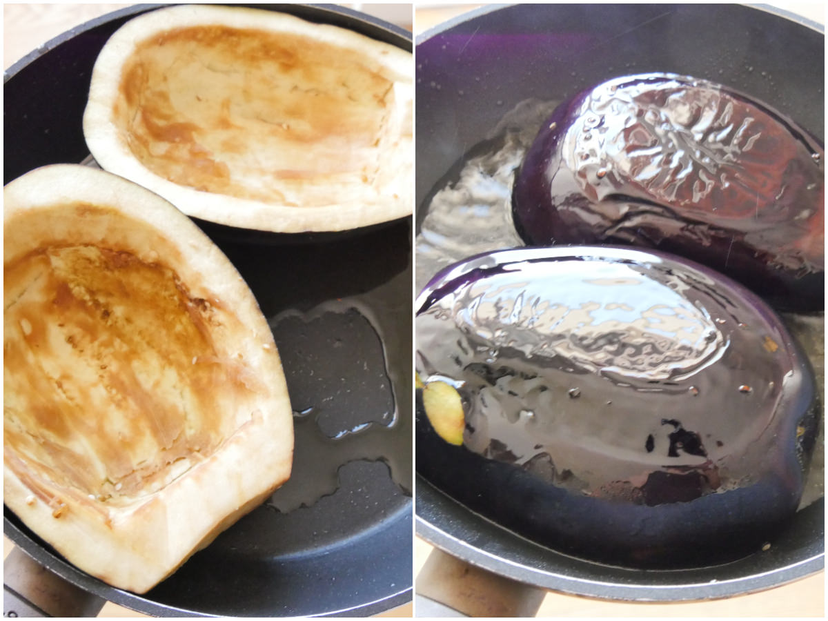 Fate scaldare un po' di olio in una padella antiaderente, quindi cuocete i gusci di melanzane per 4-5 minuti per lato, in modo da farle dorare e insaporire senza farle ammorbidire troppo.