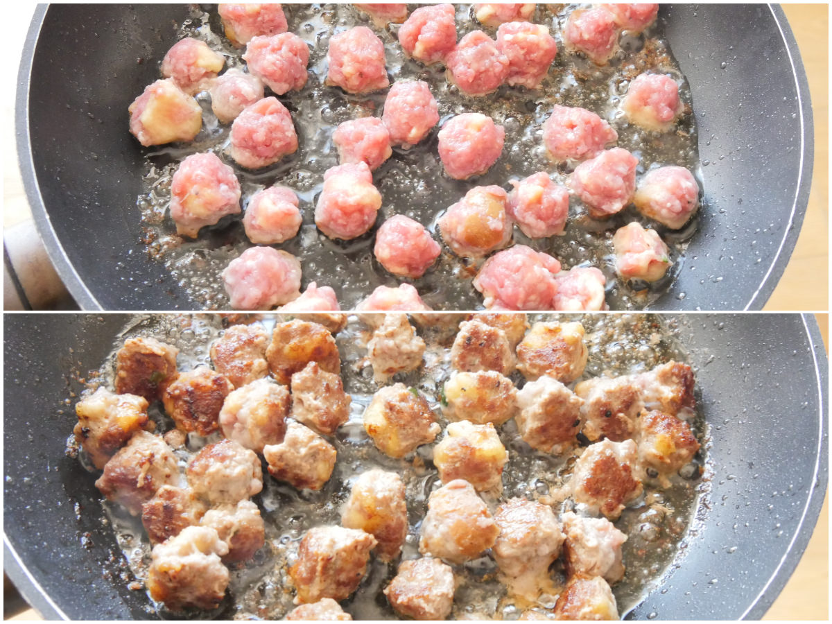 Sempre nella stessa padella che avete usato per le melanzane, cuocete anche le polpettine, rigirando spesso, quindi mettete da parte anche queste.