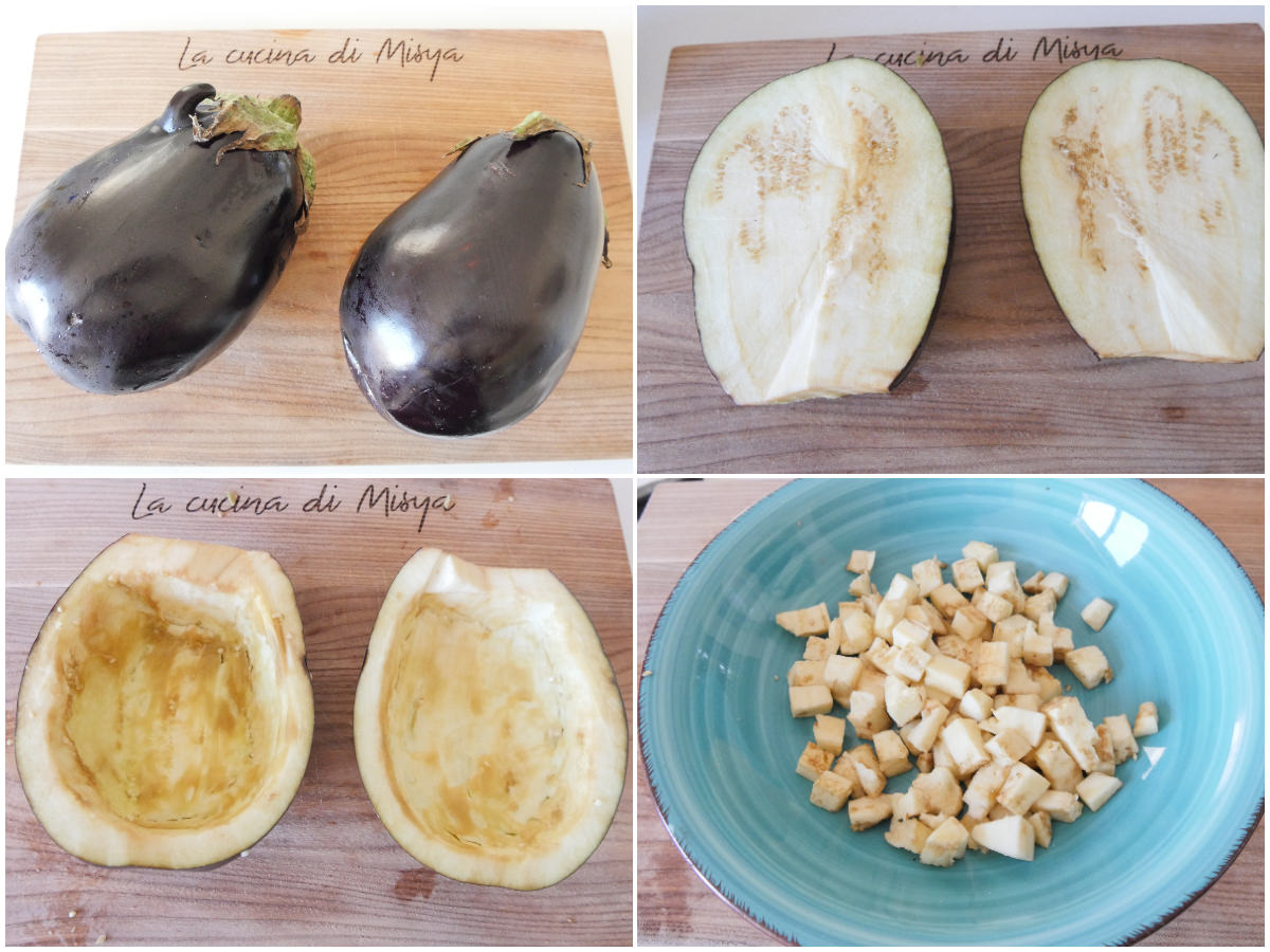 Innanzitutto lavate e mondate le melanzane, scavate via la polpa (lasciando un guscio spesso circa 1 cm) e tagliate la polpa a dadini piccolini.