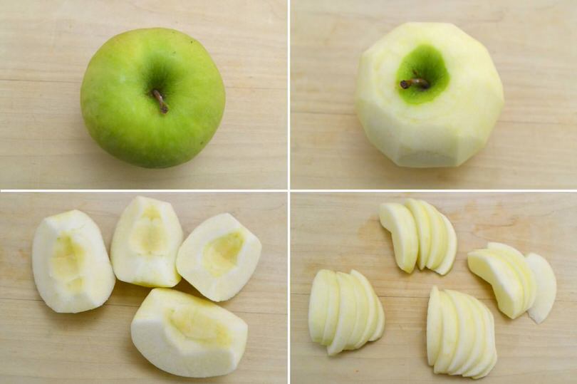 Sbucciate le mele, eliminate il torsolo centrale e tagliatele a fettine sottili.