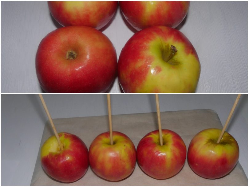 Lavate le mele a temperatura ambiente, asciugatele, togliete il picciolo e infilzatele ogni mela con uno stecco di legno o di plastica