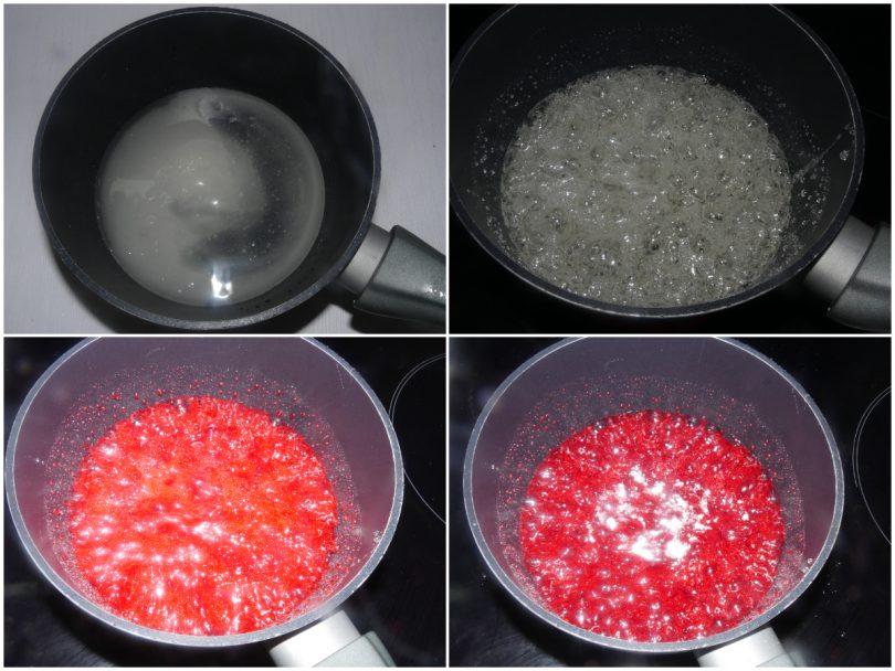Portare lo sciroppo ad ebollizione, deve raggiungere i 100°, quindi aggiungete il colorante e merscolate.
