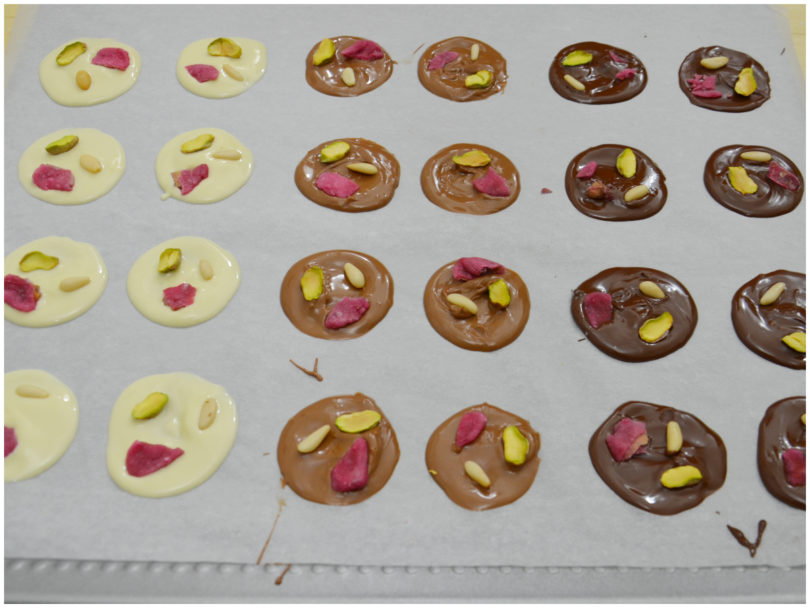 Distribuite le rose, i pistacchi ed i pinoli sui dischi di cioccolato, quindi lasciate solidificare il cioccolato.