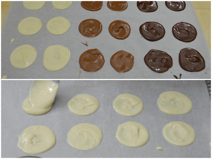 Spezzettate il cioccolato, mettete i 3 tipi di cioccolato separatamente in 3 ciotole quindi sciogliete a bagnomaria.