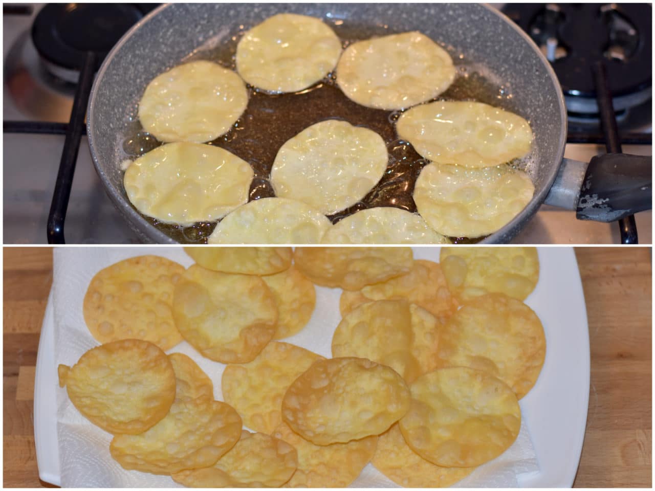 Friggete in olio di semi ben caldo, girate i dischetti una volta dorati, fate dorare anche l’altro lato e mettete su carta assorbente ad asciugare