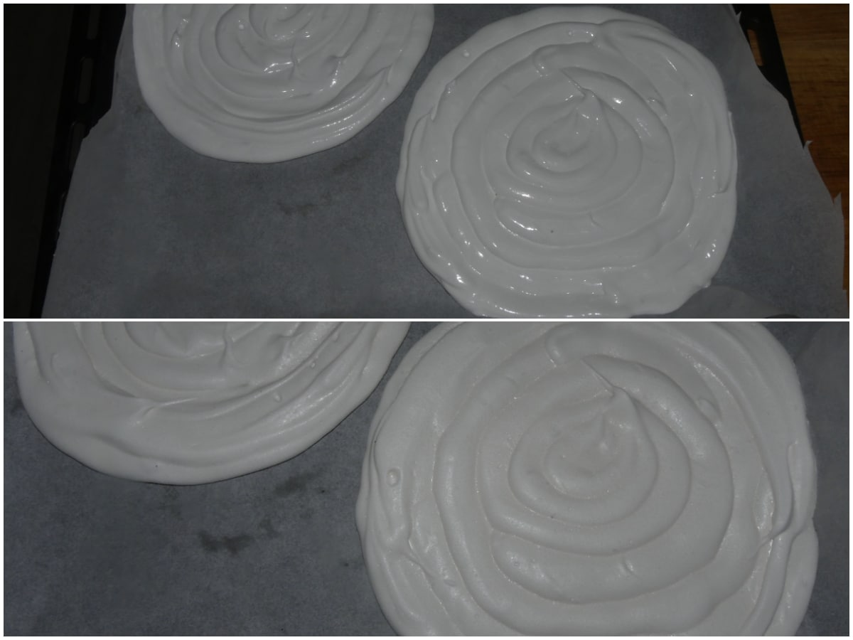 Cuocete per circa 2 ore a 100°C, in forno ventilato già caldo: dovrete ottenere una meringa gonfia, secca e leggera; a fine cottura lasciate raffreddare completamente nel forno spento, con lo sportello semi aperto.
