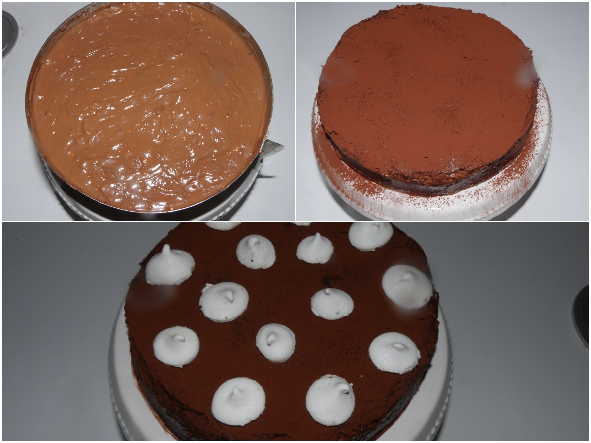 Coprite con metà della crema restante, poi completate con il secondo disco di meringa (mettetelo capovolto, così avrete una superficie piana in cima) e la crema rimasta, infine spolverizzate con abbondante cacao e decorate con i ciuffetti di meringa.