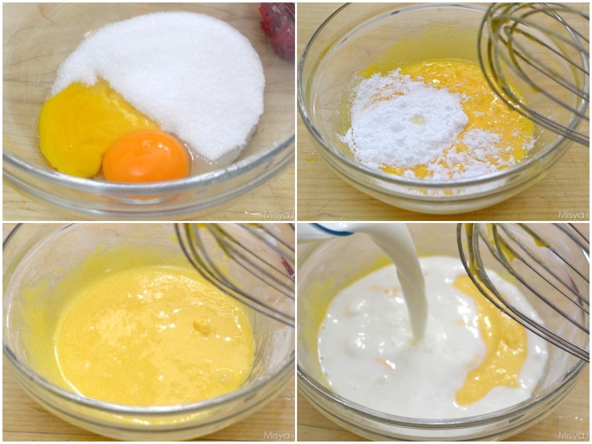 Nel frattempo preparate la crema pasticcera al cioccolato: sbattete i tuorli con lo zucchero, poi incorporate la fecola di patate ed infine il latte.