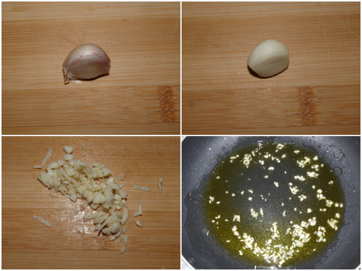 Mondate l'aglio, tritatelo finemente e fatelo appassire in un'ampia padella antiaderente con dell'olio.