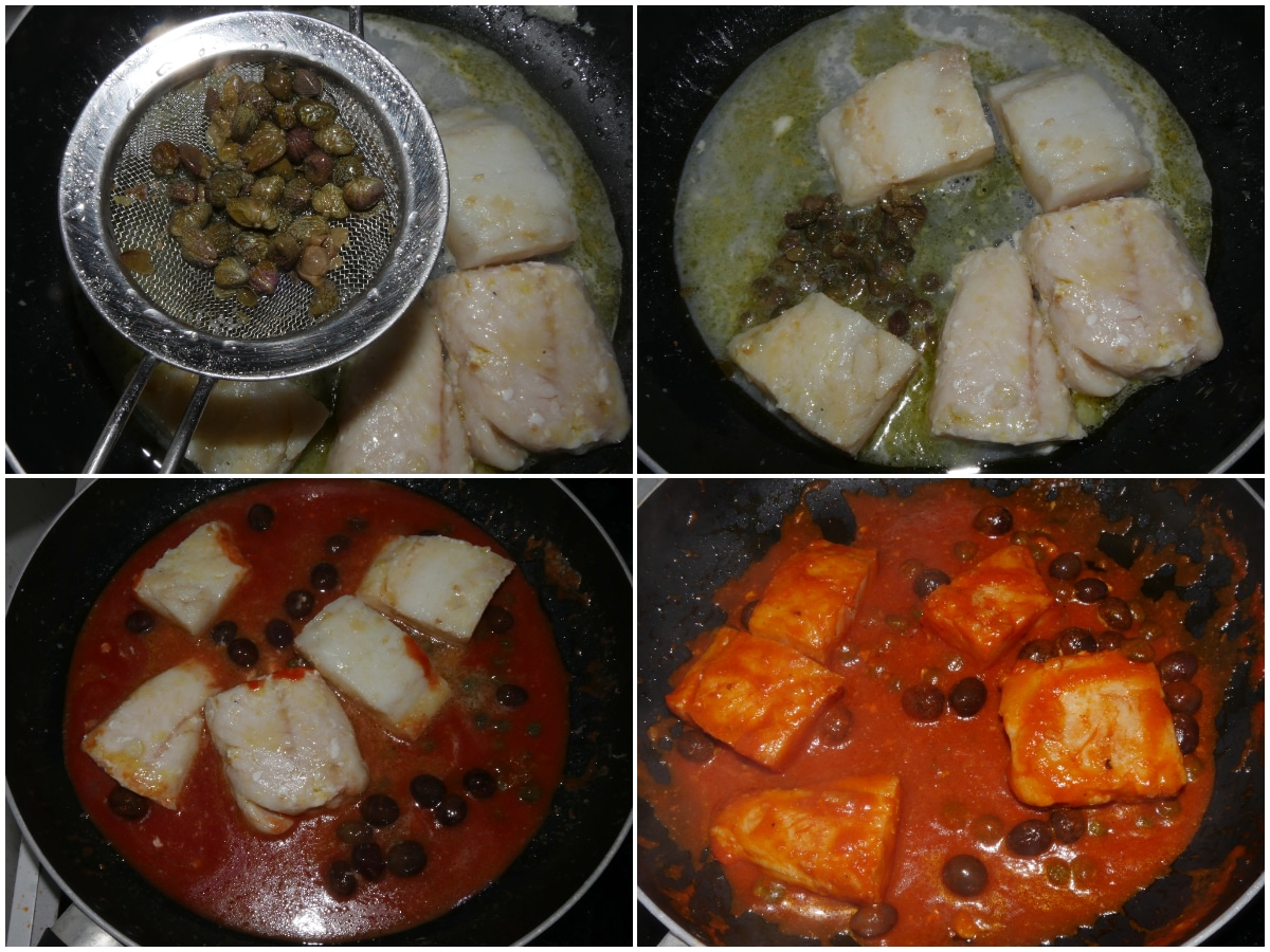 Unite i capperi dissalati e, una volta evaporato il vino, anche olive, passata, una tazzina di acqua, sale e pepe, chiudete con coperchio e lasciate cuocere a fiamma medio-bassa per 10 minuti.