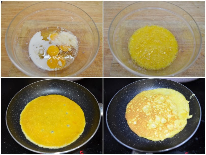 Sbattete le uova con sale, pepe e parmigiano, quindi cuocetele una per volta in una padellina da 18-20 cm circa con un filo d'olio.