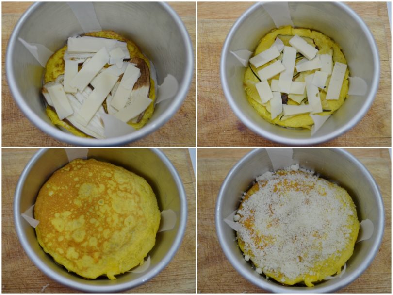 Componete la millefoglie in una teglia a cerniera rivestita di carta forno, alternando frittata, verdure, provolone a fettine.