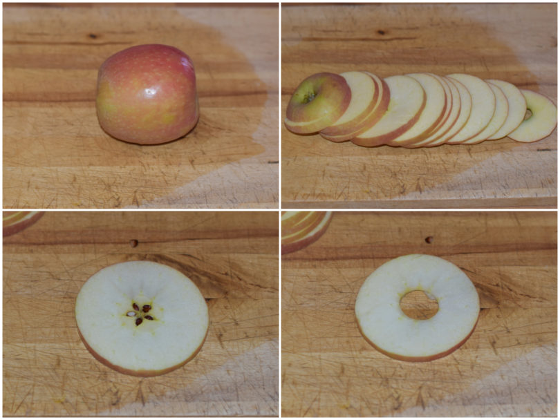 Lavate bene la mela, tagliatela a fette spesse massimo 0,5 cm (o avrete difficoltà a tagliarla e mangiarla senza rompere tutto) ed eliminate la parte del torso al centro.